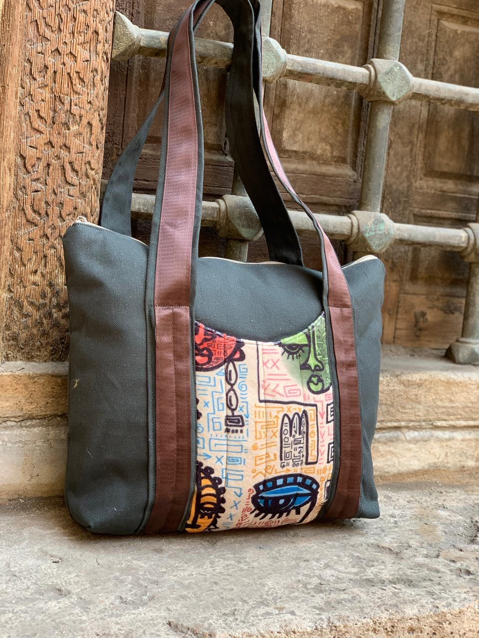 حقيبة مصنوعة من قماش الدك عالي الجوده المطعم ، مزينة بتطعيمات مميزه , من الداخل واسعه ومريحه