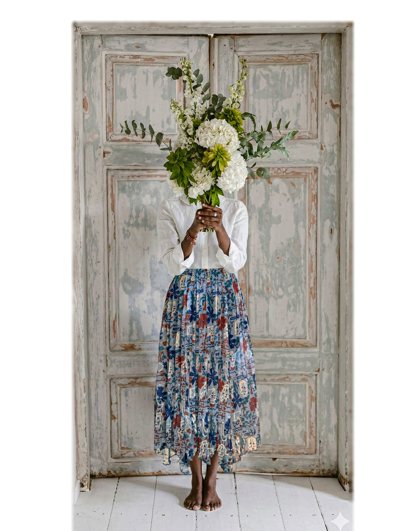 A statement skirt crafted from lightweight, flowing tulle, featuring Janoubi’s signature artistic prints inspired by African and Nubian heritage. The design blends rich colors and expressive motifs, creating a vibrant patchwork effect that feels both modern and timeless.